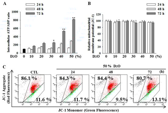 The balance between the synthesis and turnover of ATP may be affected in cells treated with D2O. D2O increased the ratio [ATP]/[ADP] in a time- and dose-dependent manner (Figure 4A). To test whether the changes in ATP levels were accompanied with augmentation of mitochondrial dysfunction [24], the [ATP]/[ADP] ratio was measured by JC-1 staining. Nonetheless, there were no noticeable changes in mitochondrial membrane potential following D2O treatment (Figure 4B,C).