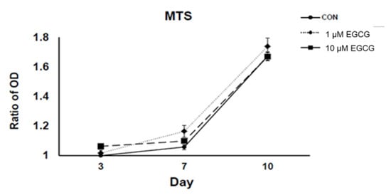 There was no significant change in MTS assay and cell cycle after EGCG treatment at 1 and 10 µmol/L for 24 and 48 h (Figure 1). With the treatment of EGCG, the viability of hBMSCs was not affected by EGCG at both 1 and 10 µmol/L (both p > 0.05). The experiments were repeated at least three times and showed similar effects.