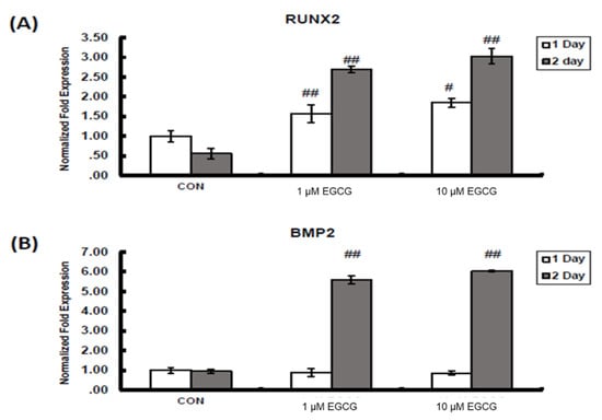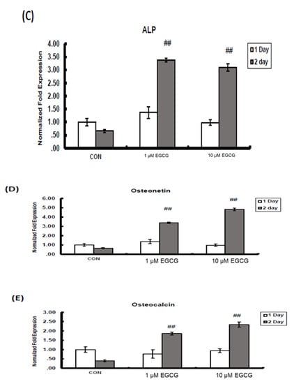The mRNA expression of osteogenic marker genes, including runt-related transcription factor 2 (Runx2), bone morphogenetic protein 2 (BMP2), alkaline phosphatase (ALP), osteonectin and osteocalcin, increased significantly after EGCG treatment for 24 and 48 h at both the concentrations of 1 and 10 µmol/L. The expression of BMP2, Runx2, ALP, osteonectin and osteocalcin were quantified by real-time PCR. There were significant changes in all genes after treatment for 48 h but not 24 h except in the case of Runx2. In Runx2, mRNA expression increased 57% (p < 0.01) and 85% (p < 0.05) with 1 and 10 µmol/L, respectively, at 24 h, and 169% (p < 0.01) and 203% (p < 0.01) with 1 and 10 µmol/L, respectively, at 48 h. In BMP2, mRNA expression increased 459% (p < 0.01) and 502% (p < 0.01) with 1 and 10 µmol/L, respectively. ALP mRNA expression was enhanced 239% (p < 0.01) and 210% (p < 0.01) at concentrations of 1 and 10 µmol/L of EGCG, respectively. The mRNA expression in osteonectin was amplified 239% (p < 0.01) and 383% (p < 0.01) after EGCG treatment at concentrations of 1 and 10 µmol/L, respectively. The mRNA expression in osteocalcin was amplified 86% (p < 0.01) and 134% (p < 0.01) after EGCG treatment at concentrations of 1 and 10 µmol/L (Figure 2), respectively. The experiments were repeated at least three times and showed similar effects.