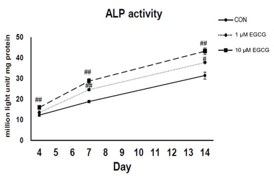 In comparison to control cultures, the ALP activities of EGCG (1 and 10 µmol/L)-treated cultures were increased by 11% and 30% (p < 0.05) on the 4th day, by 30% (p < 0.01) and 52% (p < 0.01) on the 7th day, and 20% (p < 0.05) and 37% (p < 0.05) on the 14th day, respectively (Figure 3). The experiments were repeated at least three times and showed similar effects.