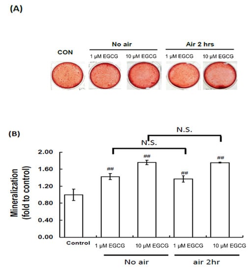 Effects of EGCG on hBMSC mineralization (A)–(B). Different concentrations of EGCG, 1 and 10 µmol/L, increased mineralization by 43% (p < 0.01) and 76% (p < 0.01), with respect to the control, respectively. With antioxidant ability evaluated as playing an important role in enhancing mineralization of EGCG in hBMSCs, EGCG was combined with air with O2 to deplete its antioxidant ability. After EGCG was combined with air, it was still able to increase mineralization by 37% (p < 0.01) and 75% (p < 0.01), with respect to the control, respectively. There was no difference between fresh EGCG and EGCG in air, which indicated that antioxidant ability did not play an important role in enhancing mineralization. ## p < 0.01 compared with CON.