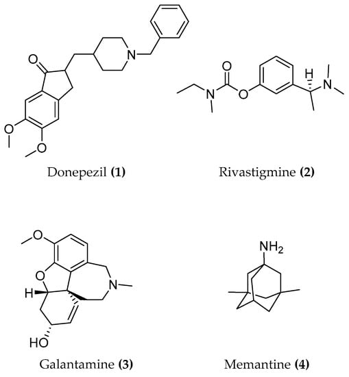 The conventional pharmacotherapy of AD makes use of compounds which inhibit the enzyme AChE (donepezil, rivastigmine, and galantamine) in order to increase the levels of acetylcholine in the nervous tissue of the brain ((1–3), Figure 1). However, these compounds can improve the cognitive deficits of the disease only for a couple of months before losing activity. The shortness of the effect could be due to a decrease of the AChE itself in the relevant regions of the brain [9]. Later in time, another drug was introduced for the treatment of AD, i.e., memantine ((4), Figure 1) being a glutamatergic antagonist which protects nerve tissue against glutamate-mediated excitotoxicity. Unfortunately, both classes of drugs only provide a symptomatic relief without preventing the progression of the disease, a fact which is not surprising given the intricacy of the pathology. Thus, there is a desperate need to find selective and powerful drugs to improve the treatment of AD [1].