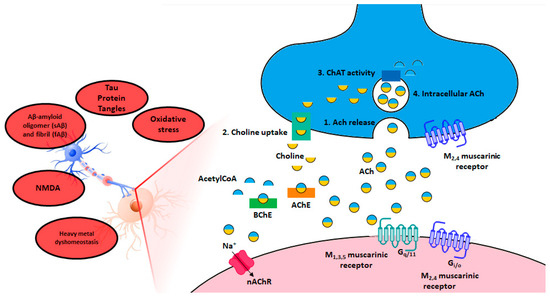Figure 2. In the red circles some hallmarks of Alzheimer’s disease are reported, the cholinergic hypothesis is emphasized through the schematic representation of a pre and postsynaptic neuron. Zoom in on the cholinergic synapse in particular biosynthesis, storage, release, hydrolysis of ACh and AChR locations are illustrated (modified from Auld et al. [24]).