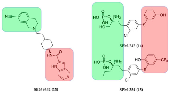 Figure 8. Structures of bitopic hybrids. 13 D3 dopaminergic ligand SB269652; 14, 15 bitopic S1P3 antagonist. Orthosteric building block in green allosteric building block in red.