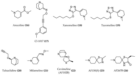 Considerable efforts were made to obtain agonists for M1 but their off-target effects preclude the therapeutic use. Various agonists for M1 muscarinic receptor including arecoline ((16), Figure 9) CI-1017 ((17), Figure 9), xanomeline ((18), Figure 9), tazomeline ((19), Figure 9), talsaclidine ((20), Figure 9) and milameline ((21), Figure 9) do not show sufficient selectivity for the M1 subtype. The most prominent candidates in the past few years were the M1 muscarinic agonists AF102B ((22), Figure 9) (cevimeline; approved in the USA and Japan for Sjogren’s Syndrome and having excellent pharmacokinetic properties), AF150(S) ((23), Figure 9) and AF267B ((24), Figure 9) which additionally show a significant neurotrophic effect, inhibit Aβ and oxidative stress induced cell death as well as apoptosis in PC12 cells transfected with the M1 muscarinic receptor [5,75].