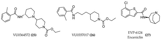 Furthermore, the M1 selective agonist lead candidates VU0364572 ((25), Figure 10) and VU0357017 ((26), Figure 10) were tested on cell lines as well as animal models and exhibited encouraging as well as effective properties on various parameters. The compound VU0357017 not only showed excellent M1 subtype selectivity but also a good blood brain barrier (BBB) penetration and in vivo efficacy [38]. EVP-6124 (enceniclin) ((27), Figure 10) was the last cholinergic receptor agonist which entered phase 3 trials but it was withdrawn due to severe gastrointestinal adverse effects [3].