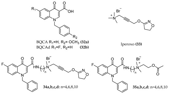 The same approach was applied for exploring the M1 receptor binding pockets. Among several selective M1 allosteric modulators known, the promising group of N-benzyl quinolone carboxylic acids (BQCAs) was selected as positive allosteric moieties of these dualsteric M1 hybrids [59,60]. The BQCA allosteric modulator ((32a), Figure 13) was first described by the Merck laboratory. The compound is a positive allosteric modulator, an allosteric agonist, and exhibits pure subtype selectivity for the M1 receptor: no agonism, antagonism, nor potentiation activity was observed at other mAChRs up to 100 µM. The concentration of ACh which needed to activate the receptor decreased up to 129-fold in the presence of BQCA and an inflection point of 845 nM is reported in the presence of 3 nM ACh. Its allosteric modulation is mediated by the interaction with the residues Y179 and W400, suggesting the binding of BQCA to the "common" allosteric site [84,85]. As an orthosteric fragment, the non-selective superagonist iperoxo ((33), Figure 13) [59] and the endogenous ligand ACh were linked to the BQCA derivative (BQCAd ((32b), Figure 13)) [60]. The two parts were connected by alkylene chains of different lengths (C4, C6, C8, C10) ((34a, b, c, d), Figure 13).