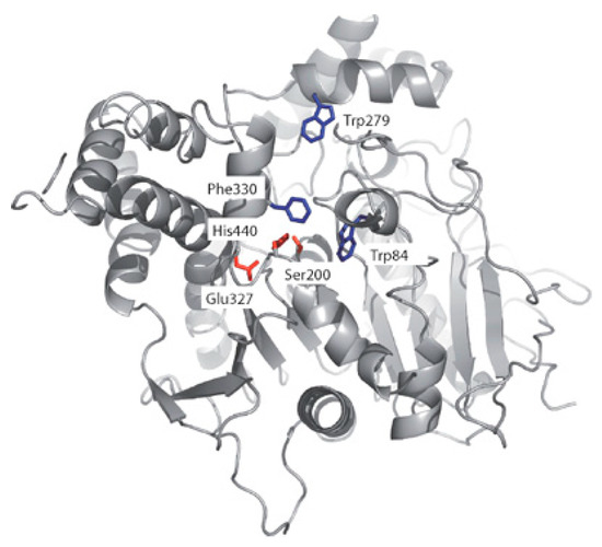Figure 18. 3D structure of native torpedo californica AChE. The catalytic triad in red, Trp84 in the CAS, Trp279 at the PAS, and the bottleneck residue Phe330 in blue. Reproduced with permission from [99].