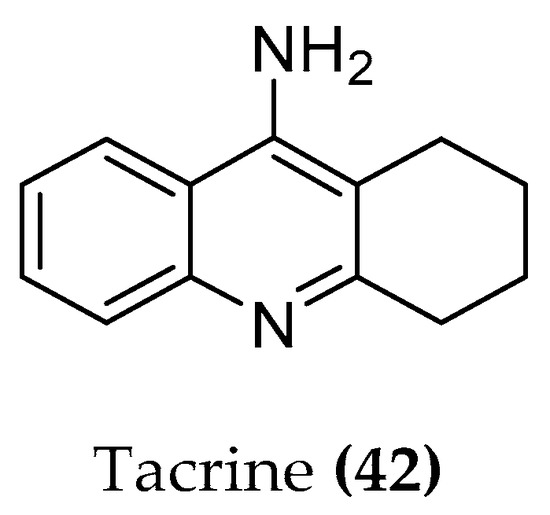 The knowledge of the active site and of the exact function of each amino acid of the catalytic triad allowed the discovery of enzymatic inhibitors. The AChE inhibitors (AChEIs) donepezil, galantamine, rivastigmine ((13), Figure 1), and tacrine ((42), Figure 19) were successfully developed and approved by international authorities. Later, tacrine was withdrawn from the market due to a significant hepatic toxicity.