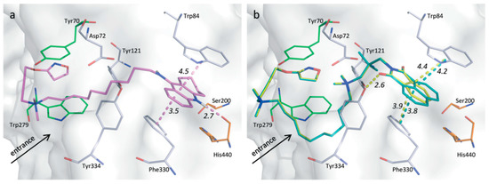 The decreasing cholinergic tone is one of the physiological reasons of the debilitating AD. To switch off a cholinergic signal, ACh is catabolized by the acetylcholinesterase (AChE) which hydrolyzes the ester of the neurotransmitter to acetic acid and choline. The enzyme also appears to be involved in the aggregation of Aβ by a peripheral anionic site (PAS) in addition to its classical enzymatic hydrolysis of ACh [96,97]. AChE inhibitors compensate the cholinergic tone in the synaptic transmission and thus, because of an augmenting ACh concentration, usually relieve the symptoms and can decrease the rate of cognitive decline for some months. However, they are not able to arrest disease progression and inexorable neurodegeneration [27]. Already in 1991, Sussman et al. described the enzyme as a narrow cavity that drives the substrate through a peripheral anionic site (PAS) to the catalytic site (CAS), where the catalytic triad Glu-His-Ser is located [98]. (Figure 18).