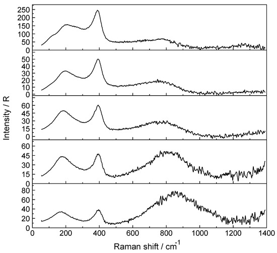 The symboles and γ′ are the isotropic and the anisotropic invariant of the Raman polarizability tensor, respectively [49,55]. The isotropic spectrum, Iiso was constructed according to Equation (3):