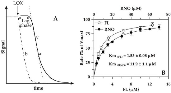 Kinetics of RNO bleaching and FL quenching catalyzed by soybean LOX-1. (A) Typical experimental traces are reported relative to: (i) spectrophotometric (or fluorimetric) measurement of the LOX-1-dependent RNO bleaching (or FL quenching) reaction (trace a) and (ii) simultaneous polarographic measurement of LOX-1-catalyzed oxygen uptake (dotted line, trace b). The reaction rate (v) and the lag phase are also indicated. (B) The rates of RNO bleaching and FL quenching, expressed as (%) of Vmax, are reported as Michaelis-Menten plots. The values of 100% Vmax correspond to 0.27 ± 0.10 ΔA440∙min−1 and 0.28 ± 0.01 ΔA485∙min−1 for LOX/RNO and LOX–FL reactions, respectively. Km values are also reported. Data are recalculated from those reported in Pastore et al. [25] and Soccio et al. [26] and expressed as mean value ± standard deviation (n = 3).
