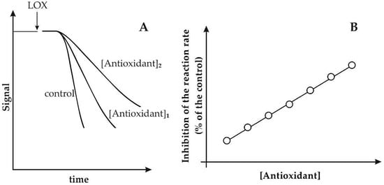 In Figure 2A, the typical behavior of LOX/RNO or LOX–FL reaction in the presence of a generic pure antioxidant compound is reported. The capability of antioxidant to inhibit the LOX-1-based reactions by typically inducing a decrease of the reaction rate, with an increasing inhibition with an increasing amount of antioxidant, is clearly highlighted.