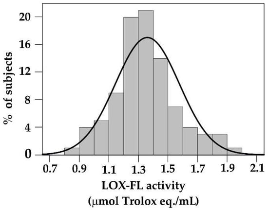As already reported (Section 2), in addition to being used for AC measurements of food extracts, LOX–FL assay has the added dimension with respect to the LOX/RNO method to be a suitable tool also for analysis of biological samples, such as human blood samples [26]. In fact, LOX–FL method can be used on both human blood serum and plasma, while LOX/RNO assay was found to require a too high volume of both biological fluids. However, caution has to be paid when plasma is obtained using EDTA or citrate as anticoagulants, since they may chelate iron that is necessary to LOX activity. In the light of this, LOX–FL assay has been preferably applied to ex vivo AC assessment of human blood serum. To date, a large number of serum samples has been analyzed by LOX–FL reaction. A normal distribution of AC data was obtained within a very wide range between 0.8 and 2 μmol Trolox eq./mL of serum (Figure 3). Interestingly, for the property to be applied to both in vitro and ex vivo AC measurements, LOX–FL assay can play an important role also in the second level of investigation, involving AC analysis of serum/plasma after food intake. High performance of LOX–FL method in both in vitro and ex vivo measurements has the advantage to provide an integrated AC evaluation of food antioxidants: by using the same assay, it is possible to verify if foods showing strong AC may provide a real beneficial effect after ingestion.