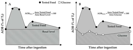 In order to facilitate the comparison of short-term effects of food intake on serum AOB, a quantification was proposed involving the evaluation of area under AOB profiles vs time. Two AOB-derived parameters, indicated as AOB-Area and AOB-Index, were proposed [34]. As shown in Figure 4, AOB-Area is obtained as change (%) of area under serum AOB profile vs time of the tested food with respect to the basal area, i.e., area below the value obtained on fasting. AOB-Index is calculated as change (%) of area under the AOB profile with respect to the area obtained after 50 g glucose ingestion, thus taking into account the effect of starch component of pasta (in terms of glucose released from starch digestion).