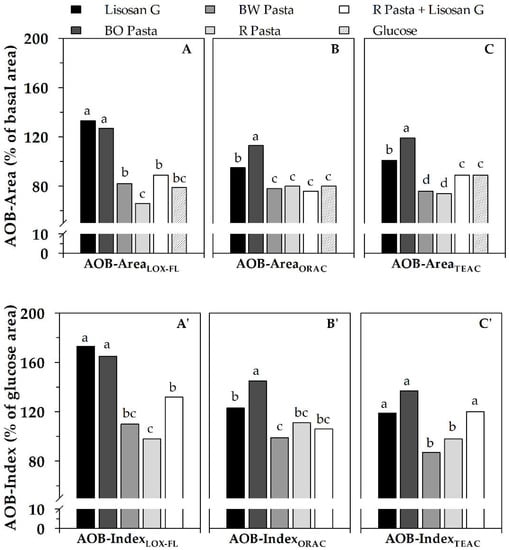 AOB-Area ((A), (B), (C)) and AOB-Index ((A’), (B’), (C’)) of serum, evaluated as ACLOX–FL/PxL (AOBLOX–FL), ACORAC/PxL (AOBORAC) and ACTEAC/PxL (AOBTEAC) ratios, after consumption of different foods in seven subjects. Serving sizes were 70 g for pastas, 20 g (fresh weight) for Lisosan G and 50 g for glucose. AOB-Area and AOB-Index values of each tested food represent areas under AOB profile vs time (from 0 to 240 min), expressed as (%) of basal area and (%) of area relative to glucose consumption, respectively (see Figure 4). Data are reported as mean value (n = 7 subjects). Within the same graph, different letters indicate significant differences at p-value equal to 0.05, according to the Duncan’s test. BO pasta: pasta supplemented with bran oleoresin; R pasta: reference pasta; BW pasta: pasta supplemented with bran water extract. Data are properly re-elaborated from that reported in Laus et al. [34].