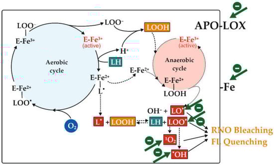 Aerobic and anaerobic reactions catalyzed by the soybean lipoxygenase (LOX)-1 isoenzyme and involved in 4-nitroso-N,N-dimethylaniline (RNO) bleaching or fluorescein (FL) quenching. The aerobic cycle of LOX-1-catalyzed dioxygenation of linoleic acid (LH, highlighted in teal) to 13-hydroperoxy-linoleate (LOOH, highlighted in orange) is shown (continuous line), as well as the secondary anaerobic cycle (dotted line) involving LOX-1 under limited oxygen conditions and generating some reactive species (highlighted in red). These may induce RNO bleaching or FL quenching. This may be inhibited by antioxidant compounds by different mechanisms (green arrows): scavenging one or more radical species; chelating or reducing iron ion; inhibiting the apoenzyme. L∙, linoleate alkylic radical; LO∙, linoleate alkoxyl radical; LOO∙, linoleate peroxyl radical; 1O2, singlet oxygen; ∙OH, hydroxyl radical. “Fe” indicates the non-heme iron atom playing a key role in LOX-1 catalysis. Adapted from Pastore et al. [25].