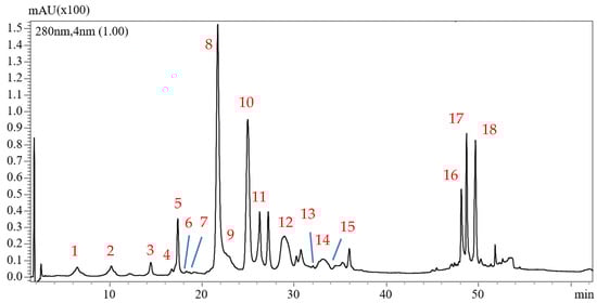 HPLC-PDA chromatogram of phenolic compounds present in one of the analyzed EVOO sample. 1: Hydroxytyrosol, 2: Tyrosol, 3: Vanillic acid, 4: Ligstroside derivative, 5: p-cumaric acid, 6: Hydroxydecarboxymethyl elenolic acid, 7: Elenolic acid, 8: Dialdehydic form of oleuropein aglycon, 9: Oleuropein aglycon, 10: Oleuropein aglycon. 11: Lygstroside aglycon, 12: Oleuropein aglycon, 13: Luteolin, 14: lygstroside aglycon, 15: Apigenin, 16: Unknown, 17: Unknown, and 18: Unknown.