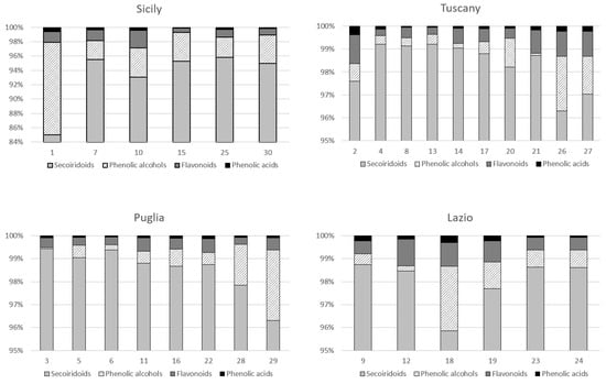Percentage distribution of phenolic compounds classes (phenolic acids, phenolic alcohols, secoiridoids, and flavonoids) for each analyzed sample in the four different Italian areas (Sicily, Tuscany, Lazio, and Puglia). Sample number refers to Table S2.