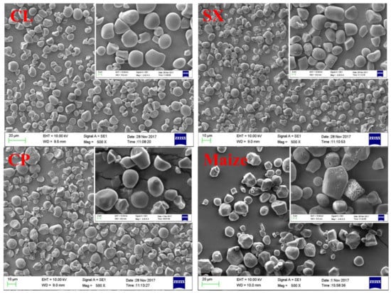 - Jane, J.L.; Kasemsuwan, T.; Leas, S.; Zobel, H.; Robyt, J.F. Anthology of starch granule morphology by scanning electron-microscopy. Starch 1994, 46, 121–129. [Google Scholar] [CrossRef]