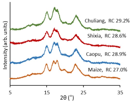 The crystalline structure of starch was analyzed using X-ray diffraction (XRD), and the diffraction patterns are displayed in Figure 2. All longan seed starch had an A-type crystalline structure with the main diffraction peaks at around 15, 17, 18, and 23° 2θ, which is the same as the crystalline type of normal maize starch [13]. The relative crystallinity of the starch from the seeds of the three longan cultivars was slightly higher than that of normal maize starch (27.0%), with Chuliang having the highest value (29.2%) followed by Caopu (28.9%) and Shixia (28.6%).