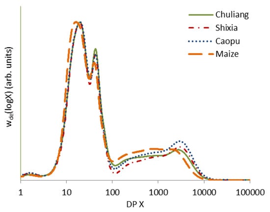As can be seen from Figure 3, the starch from all the three longan seed types showed two peaks at about DP 20 and 43 in the amylopectin region. The two peaks covered chains ranging DP < 30 and 30–100, respectively, and correspond to shorter amylopectin chains that stay within one crystalline/amorphous lamella (normally A and B1 chains) and longer amylopectin chains that span at least two lamellae (B2 and longer chains), respectively [14]. Small differences were observed in the amylopectin CLDs with Chuliang showing a slightly higher peak at DP 43, which indicates its higher proportion of longer amylopectin chains with DP 30–100. Normal maize starch, in comparison, was lower than the other starch at this peak, suggesting its lower proportion of longer amylopectin chains. The length of amylopectin chains has been found to be associated with the relative crystallinity of starch [13]. The higher relative crystallinity of Chuliang longan seed starch (shown in Figure 2) might be a result of its higher proportion of longer amylopectin chains with the degree of polymerization (DP) ranging from 30 to 100.