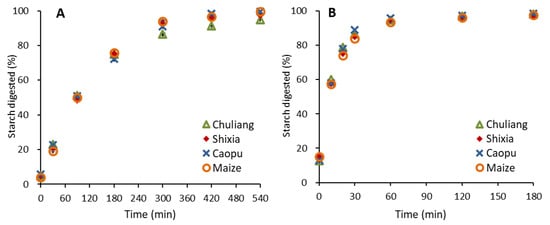 As shown in Figure 4A, all raw starch samples showed similar digestion trends with a rapid digestion phase in the first 2 h of digestion followed by a slower digestion phase until a plateau was achieved at about 8 h of digestion. Slight differences were observed in the digestion curves of the raw longan seed starch. The digestion rate coefficient values (summarized in Table 3) showed the digestion rate of Shixia seed starch was the highest, and it was similar to that of normal maize starch. Chuliang seed starch showed a significantly lower digestion rate, while Caopu showed the lowest.