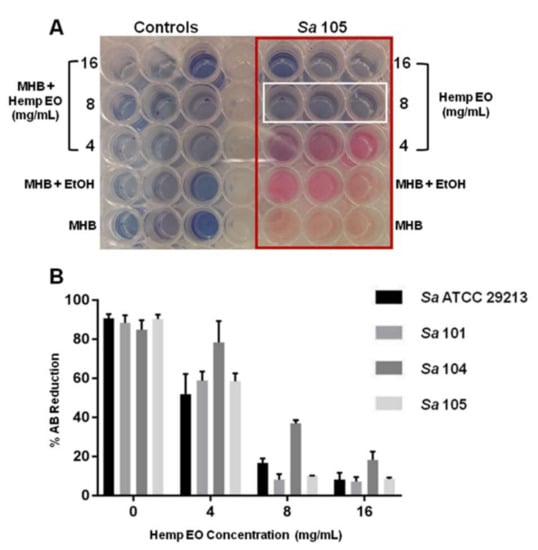 The MIC and MBC were determined in MHB using the broth microdilution method in 96-well polystyrene microtitre plates (Eppendorf, Hamburg, Germany) according to the NCCLS guidelines. The results obtained were confirmed using the alamarBlue® (AB) (Thermo Fisher Scientific, Waltham, MA, USA) planktonic susceptibility assay [25]. Hemp EO was prepared as 10% (v/v) solutions in ethanol and used in the range of 0.5–16 mg/mL; naringenin was solubilized in dimethyl sulfoxide (DMSO) and used in the range of 64–1024 μg/mL, while the bacterial concentration was 1.0 × 105 CFU/mL. The plates were incubated at 37 °C for 24 h.