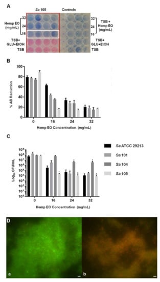The treated and non-treated biofilms were washed with PBS and then dried. Biofilms were stained with 200 μL of 0.5% Gram’s crystal violet and then rinsed with PBS and dried. The biofilm biomass was quantified by destaining the biofilms for 10 min with 33% acetic acid (by volume) and by measuring the absorbance at 590 nm [27]. With regards to the live/dead assay, S. aureus biofilms were grown and treated as previously described. The biofilms, treated with 24 mg/mL hemp EO or 2048 μg/mL of naringenin, and the corresponding non-treated controls were rinsed with PBS and stained with a BacLight kit (Thermo Fisher Scientific, Waltham, MA, USA). The analysis was performed using a Leica DMR Fluorescent Microscope (Leica microsystem, Wetzlar, Germany). Three experiments were performed in duplicate.