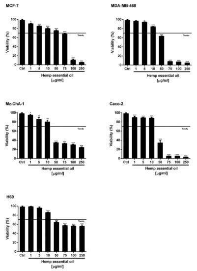 The cultured cells were seeded into 96-well microplates (20,000 cells/well), allowed to grow for 24 h, then treated with the hemp EO for a further 24 h. To perform the assay, progressive dilutions of the hemp EO in ethanol (EtOH; 100% v/v) were prepared, then assessed at 1% v/v in the cell medium.