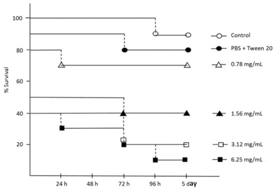 Larvae of Galleria mellonella are widely used as an invertebrate wax moth larva model to evaluate the virulence of microbial pathogens, measure the efficacy/safety of biologically active antimicrobial agents, and produce results comparable to those that can be obtained using mammals [76]. As a consequence, no ethical approval was required for this study because there was no use of mammal or animal models. In this work, the viability of G. mellonella larvae, to measure the relative toxicity of different concentrations of hemp EO, was evaluated over the study period of five days. As reported in Figure 5, no evident effects on survival were registered with 0.78 mg/mL hemp EO up to five days after treatment. The lethal dose (LD50) of Hemp EO was 1.56 mg/mL in the first 48 h of treatment, probably due to the lipophilic nature of the EO with respect to the larval biological fluids and the invasive administration procedure (Figure 5).