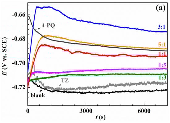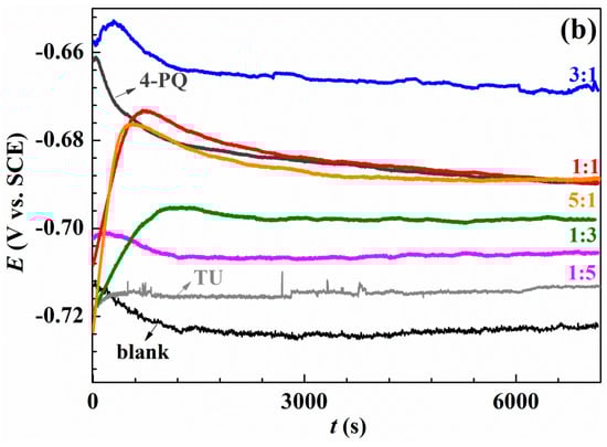 The open circuit potential measurement was performed at the beginning to ensure potentiodynamic polarization and impedance measurements under the stable system, and the results are shown in Figure 2. Figure 2a shows the results of OCP without and with single 4-PQ and TZ, and different molar ratios of 4-PQ and TZ immersed in CO2-saturated 3.5 wt.% NaCl solutions for 2 h. Figure 2b shows the results for the composite inhibitors of 4-PQ and TU. In inhibitor-free solution, due to the dissolution of the metal, the potential is always more negative than the initial immersion time (t = 0 s). In the presence of different molar ratios of inhibitors, the OCP shifts to a more positive value, because inhibitors adsorb on the metal surface. After about 1500 s, the potential reaches a steady value, and it is higher than the lack of inhibitor, indicating that the metal corrosion is protected by inhibitors [37]. Comparing to the single 4-PQ and single TU or TZ, the steady-state values of OCP with a large amount of TU or TZ are close to the single TU or TZ curve. This progressive positive of the steady state potential with the proportion of 4-PQ increasing is close to the single 4-PQ curve when the molar ratios of 4-PQ and TU or TZ are 1:1 and 5:1. However, under a certain ratio, the potential can reach the most positive value. These results indicate that the existence of a synergistic effect between 4-PQ and TU or TZ, and the molar ratio of 3:1 has the best effect of 4-PQ and TU or TZ.