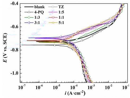 As shown in Figure 3, compared to the blank solution, the corrosion potential (Ecorr) values of Q235 steel move towards positive slightly, and the anodic reaction is inhibited with the added 4-PQ and TZ at a molar ratio of 1:5, 1:3, 1:1, 3:1, and 5:1, indicating that inhibitors adsorb on the metal surface to retard anodic dissolution of mild steel and suppress cathodic reduction simultaneously. Therefore, the composite inhibitors of 4-PQ and TZ are mixed-type inhibitors, which preferentially suppress the anodic process of corrosion. Table 2 indicates the corrosion current density (Icorr) values of 1:1, 3:1, and 5:1 have a more remarkable decline than the blank and individual inhibitor. Especially, the highest inhibition efficiency reaches 79.2% at the molar ratio of 3:1. However, when the molar ratio of 4-PQ and TZ is 1:3 or 1:5, the inhibition efficiency is better than adding 4-PQ alone, but lower than adding TZ alone. Therefore, 4-PQ needs to add a certain amount to promote the synergistic effect in the composite inhibitors.