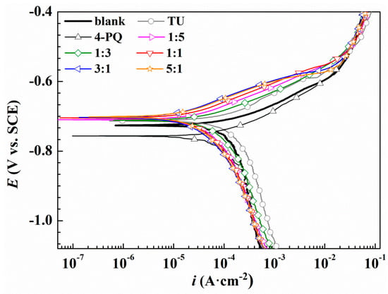 To further assess the synergistic effects between 4-PQ and sulfur-containing compounds, potentiodynamic polarization experiments were conducted for Q235 steel without and with 2 × 10−4 mol/L inhibitors at different molar ratios in CO2-staturated 3.5 wt.% NaCl solutions at 60 °C. Figure 3 and Figure 4 show the potentiodynamic polarization curves of blank (without corrosion inhibitors) and different corrosion inhibitors, respectively. The fitting results of the polarization curves used Tafel extrapolation by the software, C-view, in which other electrochemical parameters and the inhibition efficiencies of inhibitors can be determined from the corrosion current densities (Icorr), as shown in Table 2 and Table 3, respectively.