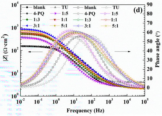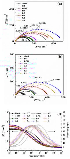 The effect of the mixture of 4-PQ and sulfur-containing compounds on the Nyquist and Bode plots for mild steel in CO2-saturated 3.5 wt.% NaCl solution at 60 °C are presented in Figure 5. As seen from Nyquist plots, the working electrode immersed in different mole ratios all have a depressed semicircle with a center under the real axis at a high frequency range. This is generally attributed to the roughness of the electrode surface, the uneven distribution of the carbon steel surface, or the adsorption of the inhibitors on the surface of carbon steel [38,39]. In the whole frequency range, the appearance of capacitive semicircles, as observed in all Nyquist spectra, is attributed to the charge-transfer reaction and double layer capacitance. As labeled in Figure 5a, the diameter of 1:3 is less than 1:5 for the mixture of 4-PQ and TZ, but both of them are smaller than the diameter of TZ alone, which means the inhibition efficiency will be dominated by TZ and the synergistic effect with 4-PQ will be weak if TZ hold the main proportion. Then, the diameter increased significantly with the proportion of 4-PQ that increased. As seen in Figure 5b, the curve of 4-PQ mixed with TU at different molar ratios is the same as that mixed with TZ, but the semicircles’ diameter is larger than the mixture of 4-PQ and TZ. Notably, the diameter of the semicircle is the largest when the molar ratio of 4-PQ and TZ (or TU) is 3:1.