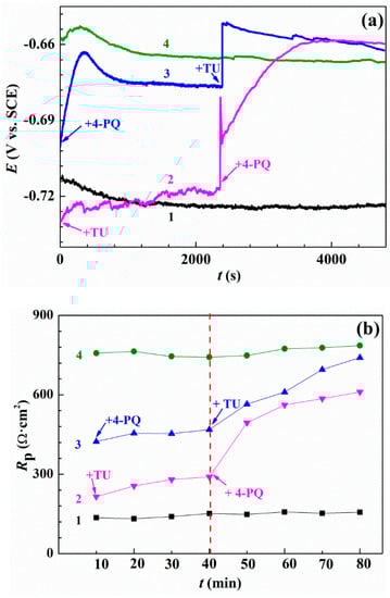 In order to further study the synergistic mechanism of mixed corrosion inhibitors, the linear polarization resistance method was used. Figure 7 shows the OCP and polarization resistance analysis (calculated from polarization curves vs. time) with and without 4-PQ and TU in different addition sequences. As can be seen from Figure 7a, curve 1 and 4 are the blank solution with the addition of mixed corrosion inhibitors at t = 0 s for comparison, respectively. Curve 2 is the addition of single TU at t = 0 s, and the values of OCP are close to curve 1 and increased slowly, then the addition of another corrosion inhibitor 4-PQ at t = 2400 s causes the OCP curve to rise sharply. Curve 3 shows addition in the reverse order, and is thus near to curve 4 at the beginning. However, all curves expect the blank solution (curve 1) are stabilized at the close-set positions and all the solutions contained 2 × 10−4 mol/L mixed inhibitors of 4-PQ and TU with 3:1 in the end.