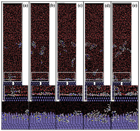 Molecular dynamics simulations of the adsorption process of corrosion inhibitors’ mixtures on Fe (1 1 0) surface under different conditions are presented in Figure 10. In a number of experimental studies, the adsorption of organic inhibitors relies on the lone pair electrons to form covalent bonds with the orbitals of metal atoms. N 1s exists in the following two forms: One is the Fe-N adsorption bond (399.6 ± 0.1 eV) [48,49], which is mainly contributed by the pyridine, quinolone, and the ammonium groups of quaternary ammonium salt, and another is the bonding between Fe and C-N-H2 (400.9 ± 0.3 eV) from thiourea [50,51]. The XPS spectrum around B.E. 162–164 eV, which is often observed on the steel surface when use S-containing corrosion inhibitors, can be ascribed to the S-Fe adsorption bond [28,52,53]. The MD simulation further proves the adsorption ability and configurations of these inhibitors at different molar ratios on metal surfaces (Supplementary Materials, Video S1–S5). The side views of 4-PQ and TU reveals that the total number is 12 with the ratio of 1:5, 1:3, 1:1, 3:1, and 5:1, respectively. Some corrosion inhibitors are free in aqueous solution while the others are adsorbed on the Fe (1 1 0) surface at different molar ratios. The nitrogen-containing heterocyclic of 4-PQ provides the lone pairs of electrons to form covalent bonds with the empty orbitals of iron, and adsorbs flat on the active sites of the metal surface. The N and S atoms in the TU structure also play the same role.