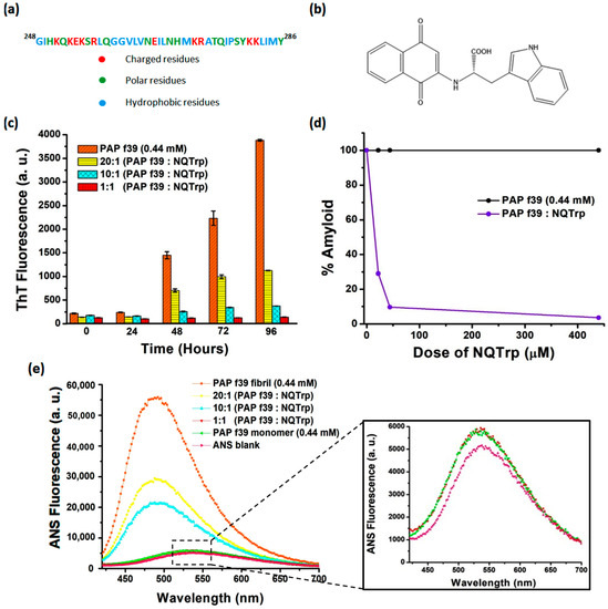 (a) Amino acid residues of the PAP f39 peptide fragment. (b) Molecular structure of NQTrp. (c) ThT fluorescence assay showing the inhibition of PAP f39 peptide aggregation in the absence and presence of NQTrp. (d) Plot showing % amyloid remaining in the mixture after the inhibition assay. (e) ANS fluorescence assay showing the dose-dependent inhibition of PAP f39 aggregation by NQTrp; inset shows the overlapping ANS emission spectra of PAP f39 treated with an equimolar ratio of NQTrp and the PAP f39 monomer along with the ANS blank.