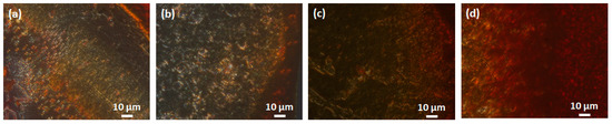 Representative Congo red birefringence images showing a decrease in amyloid load after incubation with various doses of NQTrp: (a) Control, i.e., aggregates of PAP f39 (440 μM) in the absence of NQTrp; Treatment, i.e., molar ratio of PAP f39:NQTrp: (b) 20:1, (c) 10:1, (d) 1:1.