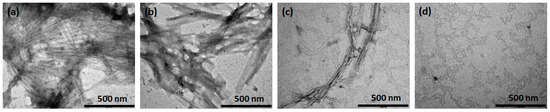Representative TEM images showing the inhibition of fibril formation in the absence or presence of various molar ratio of PAP f39:NQTrp. (a) Control, i.e., aggregates of PAP f39 (440 μM) in the absence of NQTrp, (b) 20:1, (c) 10:1, and (d) 1:1.