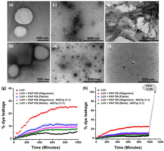 Oligomers of amyloidogenic proteins/peptides are considered to be the toxic species when compared to fibrils since they can rupture the cell membrane resulting in cell death [43,44]. Large unilamellar vesicles (LUVs) are commonly used as a model to mimic the cell membrane, and the disruption of these artificial vesicles is well established as a proxy for cytotoxicity [29,45,46]. To examine whether the oligomers resulting from PAP f39 aggregation can disrupt the LUV membrane, and whether NQTrp modulates it, a vesicle dye leakage assay was performed using carboxyfluorescein entrapped LUVs. Prior to the leakage assay, the formation and integrity of the LUVs were confirmed by TEM analysis (Figure 4a,b). The LUVs were found to be ~100–200 nm in diameter and had a uniform spherical morphology. Next, PAP f39 samples were prepared by allowing the monomers to aggregate, resulting in the formation of oligomers and subsequently fibrils, as described in Section 3.3. Since PAP f39 forms mature fibrils at ~96 h (Figure 1c), samples retrieved at ~48 h were oligomeric species as verified by TEM (Figure 4c). Samples containing untreated LUVs, i.e., without PAP f39 oligomers or fibrils, were used as the negative control and LUVs incubated with PAP f39 oligomer or fibrillar preparations (Figure 4c,e) in the absence of NQTrp were used as the positive control. Test sample preparations containing oligomers treated with NQTrp (PAP f39:NQTrp; 1:1) (Figure 4d) or fibrils treated with NQTrp (PAP f39:NQTrp; 1:1) (Figure 4f) were added separately to the LUVs, maintaining a lipid to PAP f39 molar ratio of 1:20. Triton X-100 (non-ionic detergent) was used as a reference for complete dye release from the LUVs, and the final fluorescence readout was measured according to the below equation [47]: