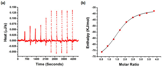 (a) Raw data of the heat pattern during PAP f39-NQTrp binding. (b) Curve showing the enthalpy changes with increasing PAP f39 to NQTrp mole fraction. Data were fitted using an independent binding model.
