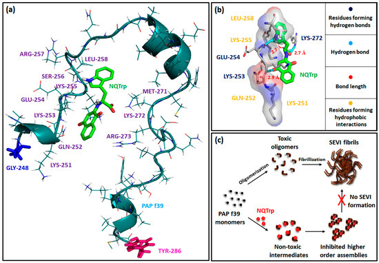 (a) Best docking conformer of PAP f39 peptide monomer with NQTrp; blue stick and pink stick: N-terminal glycine and C-terminal tyrosine of the PAP f39 monomer, respectively. Green stick: NQTrp. (b) Post-docking analysis and visualization of the interacting amino acid residues: NQTrp predominantly forms non-covalent contacts with polar and charged residues of PAP f39. (c) Cartoon showing plausible mechanism of PAP f39 aggregation inhibition by NQTrp; on pathway (absence of NQTrp): leads to oligomerization, fibrillization, and SEVI formation and off pathway (presence of NQTrp): leads to non-toxic intermediates and the inhibition of higher-order assemblies.