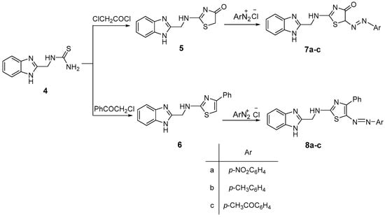 3.4.7. General Procedure for the Synthesis of the Arylazo Derivatives (7a–c) and (8a–c)