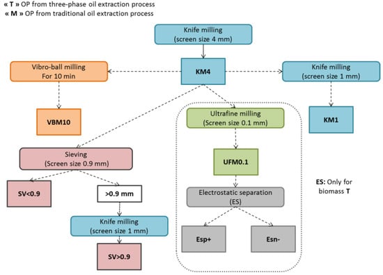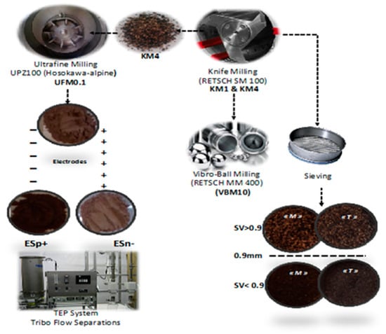 The OP biomasses were grinded by knife milling (RETSCH SM 100, Restch, Haan, Germany) using a 4 mm screen, as illustrated in Figure 6. The resulting (KM4) fraction was then subjected to knife milling using a 1 mm screen size, thus producing the (KM1) fraction. OP fraction (KM4) also underwent vibro-ball milling (VBM10) for 10 min (RETSCH MM 400). The OP ground fractions KM4 of T and M samples were then subjected to sieving with the vibratory sieve shaker (Analyset 3 Pro, Fritsch, Idar-Oberstein, Germany). Size distribution was determined by successive screening with 4, 2, 0.9, 0.5, and 0.25 mm screens. The 0.9 mm screen was used for sieving separation processes (SV < 0.9 and SV > 0.9). The KM4 of T sample was finely ground by impact and shear mill UPZ100 (Hosokawa-alpine, Augsburg, Germany) using a 0.1mm screen size (UFM0.1) operated at room temperature, at a speed of 18 000 rpm, and a feeder speed of 2 kg h−1. The (UFM0.1) fraction was subjected to an electrostatic separation process using (TEP System, Tribo Flow Separations, Lexington, KY, USA). Biomass M was not submitted to electrostatic separation as its high lipid content makes this process impossible to apply. The feeding system of the separator was operated at 150 rpm, and the OP (UFM0.1) particles were conveyed by compressed air into a charging line. The charged OP particles were then introduced into a separation chamber containing two high voltage electrodes (10000 V), where the positively charged particles (ESp+) were attracted by the negative electrode and the negatively charged particles (ESn−) were attracted by the positive electrode.