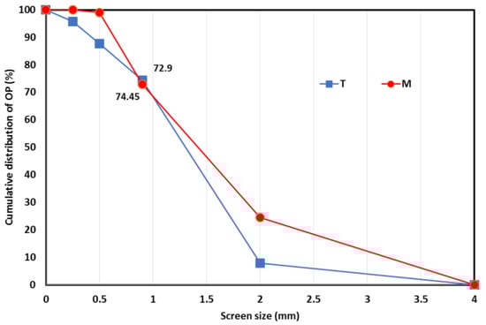 With the objective of producing more effective fractions with increased methane production, OP samples were subjected to different dry separation processes, which would make them more easily accessible to microorganisms. The sieving process is a basic mechanical separation of particles according to shapes and sizes. First, the size distribution of OP was characterized by successive sieving of KM4 fractions using different screens, as illustrated in Figure 2. As the largest fraction was separated by a 0.9 mm screen, the latter was used for the sieving fractionation process and two OP fractions were produced: SV < 0.9 (fraction with a particle size lower than 0.9 mm) and SV > 0.9 (fraction with a particle size higher than 0.9 mm). The SV > 0.9 fractions accounted for 72.9% and 74% of the entire sample for biomasses M and T, respectively. Finally, a pilot electrostatic separator was also applied to olive pomace T: Fractions ESp+ (positively charged fraction) and ESn− (negatively charged fraction) were thus obtained from UFM0.1 (Figure 1).