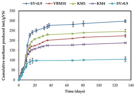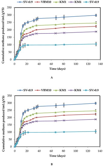 The methane production from M samples was found to be almost stabilized after the first 35 days. However, for T samples, the plateau in methane production was only reached after 130 days (Figure 3 and Figure 4).