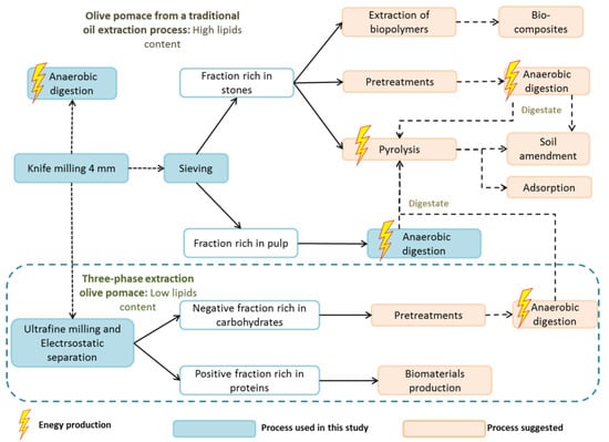 Besides thermochemical processes, anaerobic digestion produces energy through the biological conversion of organic matter into biogas. It has low nutrient and energy requirements, reduces waste volume and even stabilises it. Anaerobic digestion could therefore represent a suitable treatment for olive pomace. Indeed, the biochemical composition of olive pomace (OP) would favor a high theoretical methane production []. For example, Fezzani et al. reported that, on a dry basis, olive pomace contains about 35% carbohydrates, 44% lignin, 12% proteins, and 10% lipids []. The lignin and polyphenol content of OP causes its biodegradation to be difficult; for this reason, a preliminary pretreatment would be needed to enhance methane production from OP.