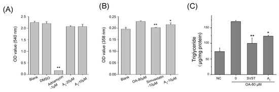 (A) The effect of oleiferasaponin A2 on HepG2 cells proliferation; (B) the lipid lowering activity of oleiferasaponin A2 under oleic acid treatment; and (C) the content of triglyceride under OA inducement. NC, blank control without oleic acid; 0, model group with 80 μM oleic acid; SVST, group with 80 μM oleic acid and 10 μM simvastain; A2, group with 80 μM oleic acid and 10 μM oleiferasaponin A2. ** p < 0.01, * p < 0.05.