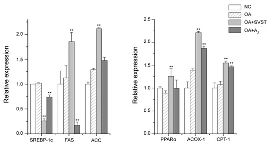 The relative expression of genes related to fatty acid metabolism on fatty acid synthesis genes (SREBP-1c, FAS and ACC) and fatty acid β-oxidation genes (PPARα, ACOX-1 and CPT-1). NC, blank control; OA, 80 μM oleic Acid; OA + SVST, 80 μM Oleic Acid + 10 μM simvastatin; OA + A2, 80 μM Oleic Acid + 10 μM Oleiferasapoin A2. Compared to the control, ** p < 0.01.